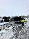 TRIST: Eier og daglig leder Daniel Bugge foran utbrente lastebiler som gikk med i brannen mandag 6. januar.