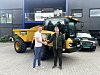 FØRST I NORGE: Lars-Petter Ulvesli (til venstre) i Rental Group Ekspert har ventet på den elektriske dumperen siden oktober i fjor. Her får han blomster med på kjøpet fra Hydrema Norges John Vidar Bakken.