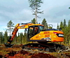 Nymoen driver markberedning for å etablere planteplasser for nye trær, og har nå fått seg skikkelig egnet utstyr til jobben. Den forrige graveren, en Doosan DX140LCR korthekk, var bra den også, men det er forskjell på 40 cm bakkeklaring til 70 cm som han har nå.