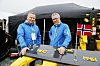 SCANLIFT MASKIN: Instruktør Christian Bligaard (t.v.) i Sapio var raskest i Scanlift Maskins testbane for radiostyrte trucker. Med tiden 1.51,72 ble han uoffisiell Norgesmester i radiotruckkjøring. Her med Jan Inge Grevstad i Scanlift Maskin AS.Anlegg&Transport