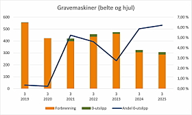 Det er i 3. kvartal solgt 19 nullutslipps gravemaskiner, som er samme antallet som i 3. kvartal i fjor. Etter 3. kvartal er det totalt i år solgt 89 nullutslipps gravemaskiner, mot 53 i samme i periode i 2024.