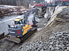 E6 BRU STENGES: Her ser vi at vingmuren er demontert og den midlertidige brua som ligger over byggegropa. Maskinen tilhører Stjørdals-firmaet Ola Raaen AS.