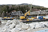 Plastring rundt brufundamentene er gjort med en Cat 374 med en klype som måtte spesialtilpasses fordi den skulle håndtere plastringstein fra 1000 mm og oppover. Rundt hvert fundament ligger det nå plastring på 4000 kvadratmeter som er utført av Sjøentreprenøren.