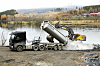Ved fjæra i Lågen står en maskin fra SBM og tar imot plastringsstein fra en av tippsemiene til Brødrene Lunn. Her lages det en arbeidsplattform på 40 ganger 24 meter for akse 2 på Lågen Bru som Implenia og Keller har fått i oppdrag i å bygge. Her skal man bruke peler på 190 centimeter i diameter, noe som ikke er så vanlig.
