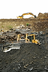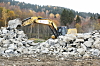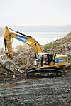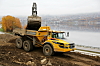Ved Øyresvika står en 100-tonner fra AF og laster en av tre Cat 775 med Mjøsmorene foran det som skal bli påhogget til Vingnestunnelen. Lenger oppe brukes «Tassen», en Cat D11 med rippertann, for å få løsnet Mjøsmorene-massene som beskrives som nesten like hardt som fjell.
