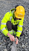 Kristian viser en dreneringsslange. Disse skal det presses mange av ned til grunnfjellet med en spesialmaskin fra Keller Geoteknikk nederst i rasgropa. Det gir en vertikaldrenering av de våte kvikkleiremassene.