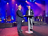 DEN FØRSTE: Konferansier Jan Erik Larssen snakket med Roar Telje på scenen under middagen. Telje var den første lederen i det som i dag heter Volvo Maskin AS.Anlegg&Transport