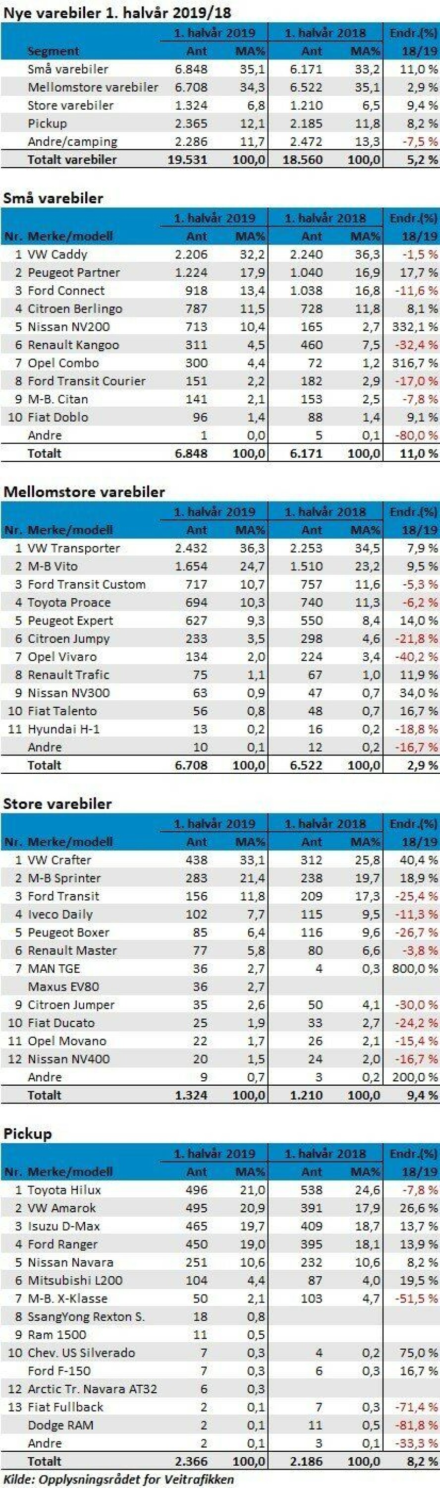 Men Volkswagen-modeller er suverent på topp i alle de andre varebil-klassene på listen over førstegangsregistrerte biler i Norge første halvår 2019.