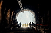 Fjernstyrt dozer skyver masser ned i en flere hundre meter dyp sjakt Arbeider i gruven inne i fjellet på Stjernøya i Nord-Norge.