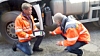 Manuell veisalting med livet som innsats Video: Har man ikke en lastebil med strøautomatikk, kan man alltids ofre et par mann til å få ut saltet på veien.