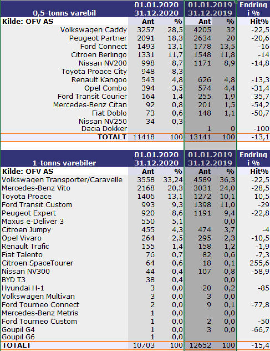 Fjoråret var meget spesielt. Ved utgangen av februar skilte det kun 12 biler mellom 2019 og 2020, men så kom covid-19 i all sin kraft og påvirket bilsalget mye. I begynnelsen av juli var salget 22,9% bak 2019! Og ved utgangen av august var varebilregistreringene ned hele 26,5% sammenlignet med 2019. Etter dette tok salget seg gradvis opp, og etter et godt høstsalg, der alle månedene endte med registreringstall godt over 2019, ble «sluttoppgjøret» fra 2019 til 2020 en nedgang på «bare» 15%. På en pressekonferanse 5. januar informerte Opplysningsrådet for veitrafikken (OFV) at de tror reduksjonen først og fremst skyldes covid-19-pandemien.
