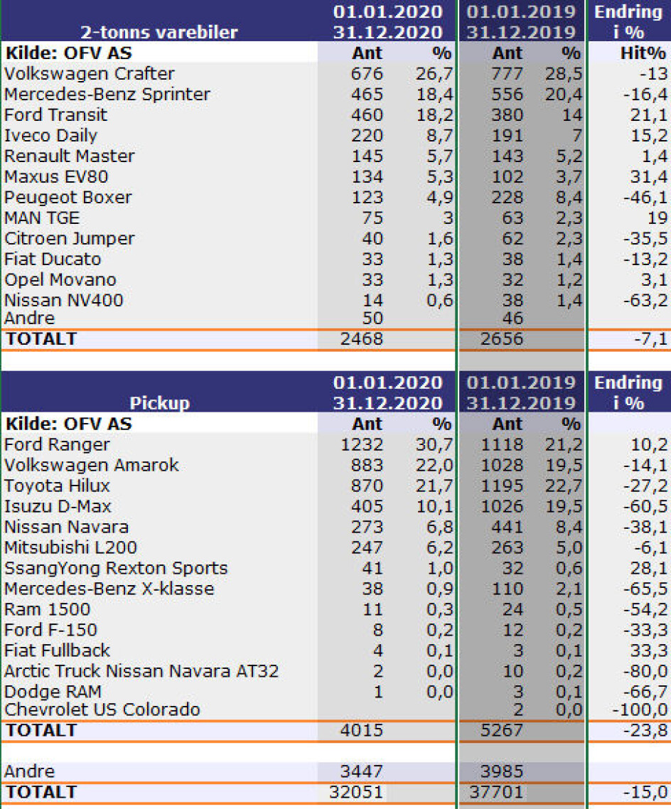 Her klatrer Ford Ranger for første gang til topps på pallen. Ikke bare er de på toppen, men det har aldri før vært registrert flere Rangere i ett år, hele 10,2% flere enn i 2019. Til tross for Fords toppår, er dette er et segment som har opplevd et spesielt år, også utenom covid-19. Med en reduksjon på hele 23,8% er dette klassen som har hatt den største prosentmessige reduksjonen. Dette skyldes nok også det faktum at hele tre av modellene har forsvunnet i løpet av året (Fiat Fullback, Mercedes-Benz X-klasse og VW Amarok)! I tillegg har Isuzu ventet på ny modell som først ankom mot slutten av året, og dermed endte merket ned hele 60% sammenlignet med året før. Toyota har ventet på en ny modell som vil introduseres i markedet nå i 2021. Det er mulig at endel kunder derfor har ventet på denne før de kjøper ny bil, og den tidligere markedslederen ble dermed henvist til tredjeplassen i 2020.