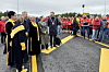 GULSTRIPE-AKSJONISTER: Rett før klokka 13.30 kunne trafikantene ta i bruk den nye veien, og det var gulstripe-aksjonistene som fikk kjøre først på den nye strekninga. De er en gruppe damer som gjennom flere år har frontet utbygginga av Betna-Stormyra i media og lagt press på politikerne. De har strikket flere hundre meter "gulstripe" av garn for å markere behovet for vei med gulstripe på strekninga.Eirik Natlandsmyr, Statens vegvesen