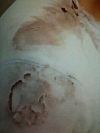 Huden var også skadd, men ikke som man kunne vente. Kjeledress-en var skitten og støvete. Det rødglødende såret så mistenkelig rent ut. Små grusfragmenter hadde klart å skjære huden som barberblad, men skaden var ikke skrubbrås – det var et brannsår.