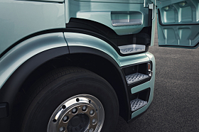TRAPP: Også trappen har fått en ny utforming med 3. trinn trukket litt innover og hjørnene avrundet.Daimler Truck Global Communicati