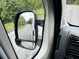 HINDER: En bred stolpa midt i sidevinduet, og en bred A-stolpe samt et stort praktisk speil hindrer noe sikt på skrått fremover.Foto: Torbjørn Eriksen