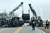 To bergingsbiler med rotatorpåbygg løftet sammen den tunge lasten av vogntoget, før semien ble fraktet bort med opphogging som en sannsynlig endestasjon.