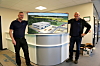 KUNST OG DEKK: Avdelingslederne Henrik Langsholdt (t.v.) på personbil, og Viggo Andersen på tungbil er godt fornøyd i nytt bygg. Under overleveringen av bygget fikk Gummiservice dette bildet, laget av kunstneren Pål Frederick Radcliffe Berthelsen.Fredrik Saugstad
