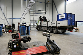 Det er ikke bare en gimmick, for det er viktig med kort ståtid for lastebileiere. Her kan det kjøres inn et modulvogntog på 25,25 meter og en semi bak samtidig, i begge løp, legges det til. 16 hjul kan skiftes på pluss-minus en time, inkludert omlegg med balansering og selve hjulskiftet, med fire mann.