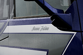 Her er det mange detaljer både utvendig og innvendig. Hytta er trukket om av FL-Buur og på bakveggen har hun hengt opp et lyskilt hvor det står Swedish Power, og det passer jo bra siden det står 750 (hestekrefter) på sidene av bilen som brukes med matchende dumperhenger fra Istrail.