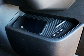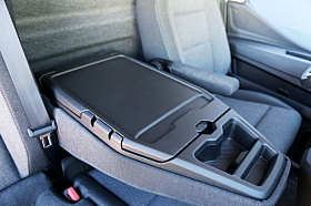 Det midterste setet felles ned slik at det blir et skrivebord, og en løsning for å oppbevare en bærbar datamaskin i tillegg til USB-porter.