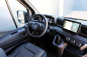 Vi kjørte først en Interstar-e ulastet på norske sommerveier og kunne jo vente oss at bilen var relativt stiv, men nei da. Om den var på motorveien eller små svingete landeveier var bilen rett og slett en nytelse å kjøre. Bra med kraft og en imponerende styring som gjør bilen lett å manøvrere i de trangeste svingene men også i parkeringssituasjoner. Ifølge Nissan er svingradiusen redusert med 1,5 m til 12,8 m. Styringen er assistert av en ny elektrisk styresnekke som er mye lettere og raskere enn i den gamle bilen som hadde en mekanisk styresnekke.