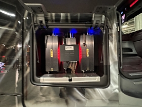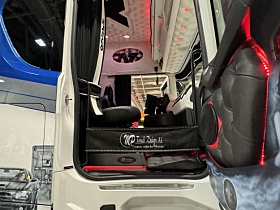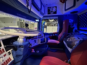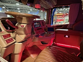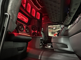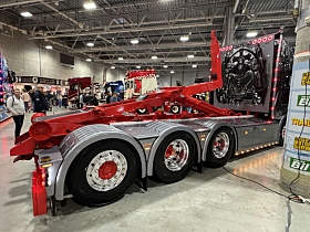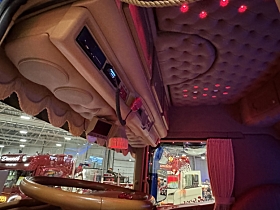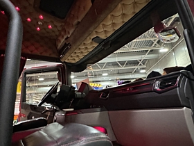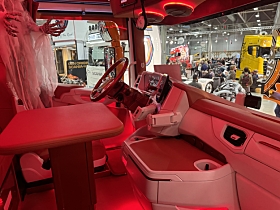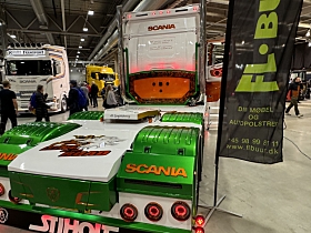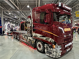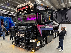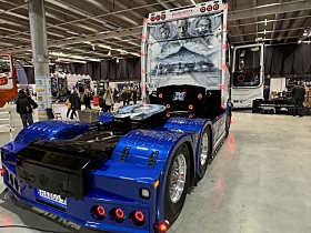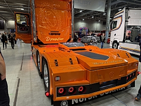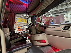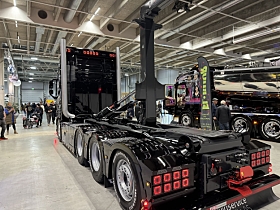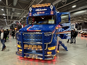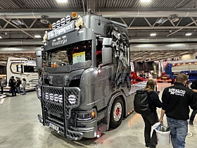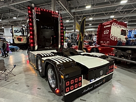 Den nye demobilen til Scania hadde fått standens mest sentrale plassering, noe som ikke er så rart. Bilen er en S770 A6x4NB 2024 modell. Den har vært hos Scania Vojens i Danmark som har bygd om bilen, om en kanskje noe mer moderat enn en del av de andre bilene vi finner i Hall E så har den en egen bakfanger, spesiallagde dørkeplater, rette avgassrør og mye lys.