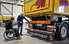 Bilen hans er en tre år gammel og spesialtilpasset Scania R650 som er bygget med rullestolheis og tilpasset hans behov. Frem til nå har han hatt en krokhenger med litt tilpasninger for hydraulikken på bakluka. Men det har vært mye styr og mange turer inn og ut av bilen når han skulle bytte kasser særlig på hengeren.
