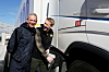 LADEGREP: Høyspent og god stemning da Ole Johannes Tønnessen og Thomas Erik Sande plugget i laderen til en av Veøy sine Volvo Electric som kjører for Rema Distribusjon.